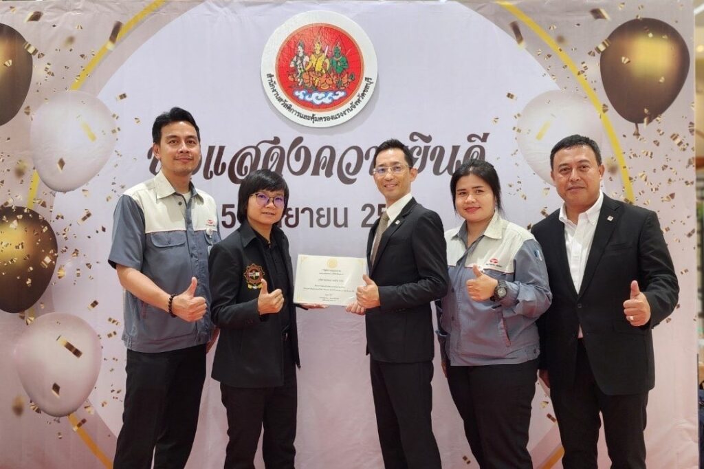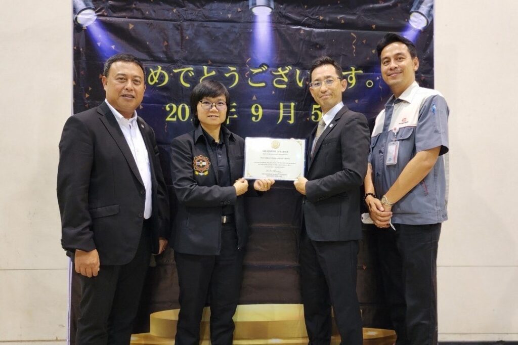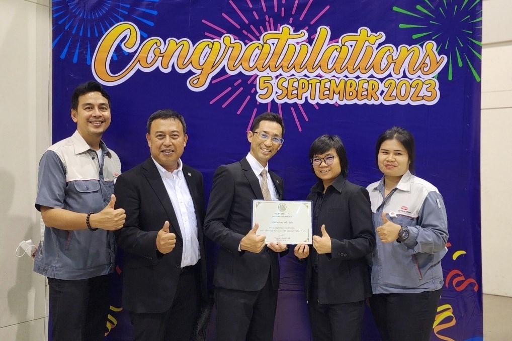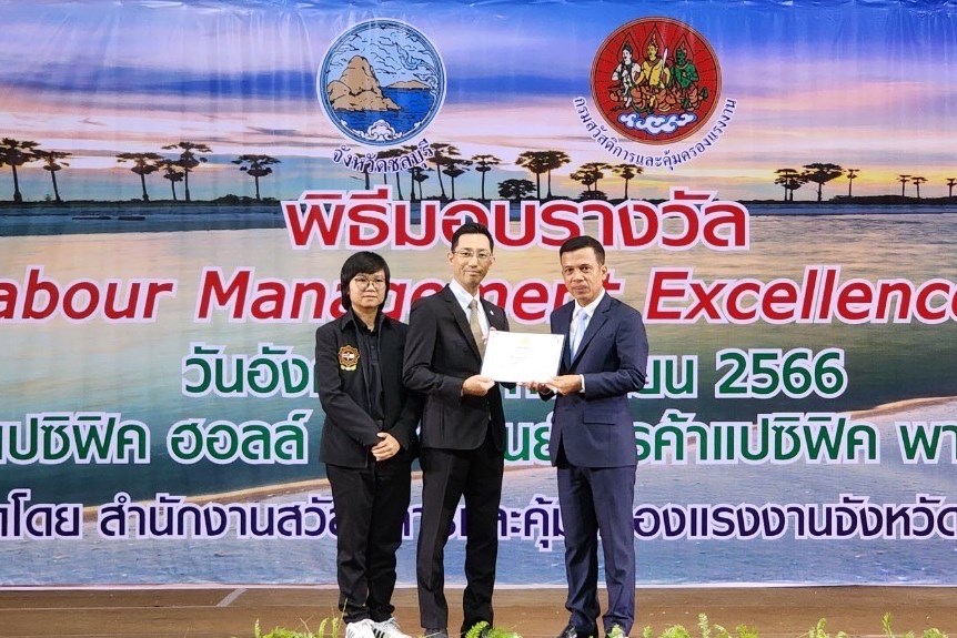 Mr. Naoyuki Masui และ นางสาว นิรัติกานต์ วงษ์ศรี เป็นตัวแทนบริษัท ไทยโตเคน เทอร์โม จำกัด รับมอบรางวัล สถานประกอบกิจการและสถานศึกษา ที่มีระบบบริหารจัดการด้านแรงงานยอดเยี่ยม ประจำปี 2566 (10ปีต่อเนื่อง)